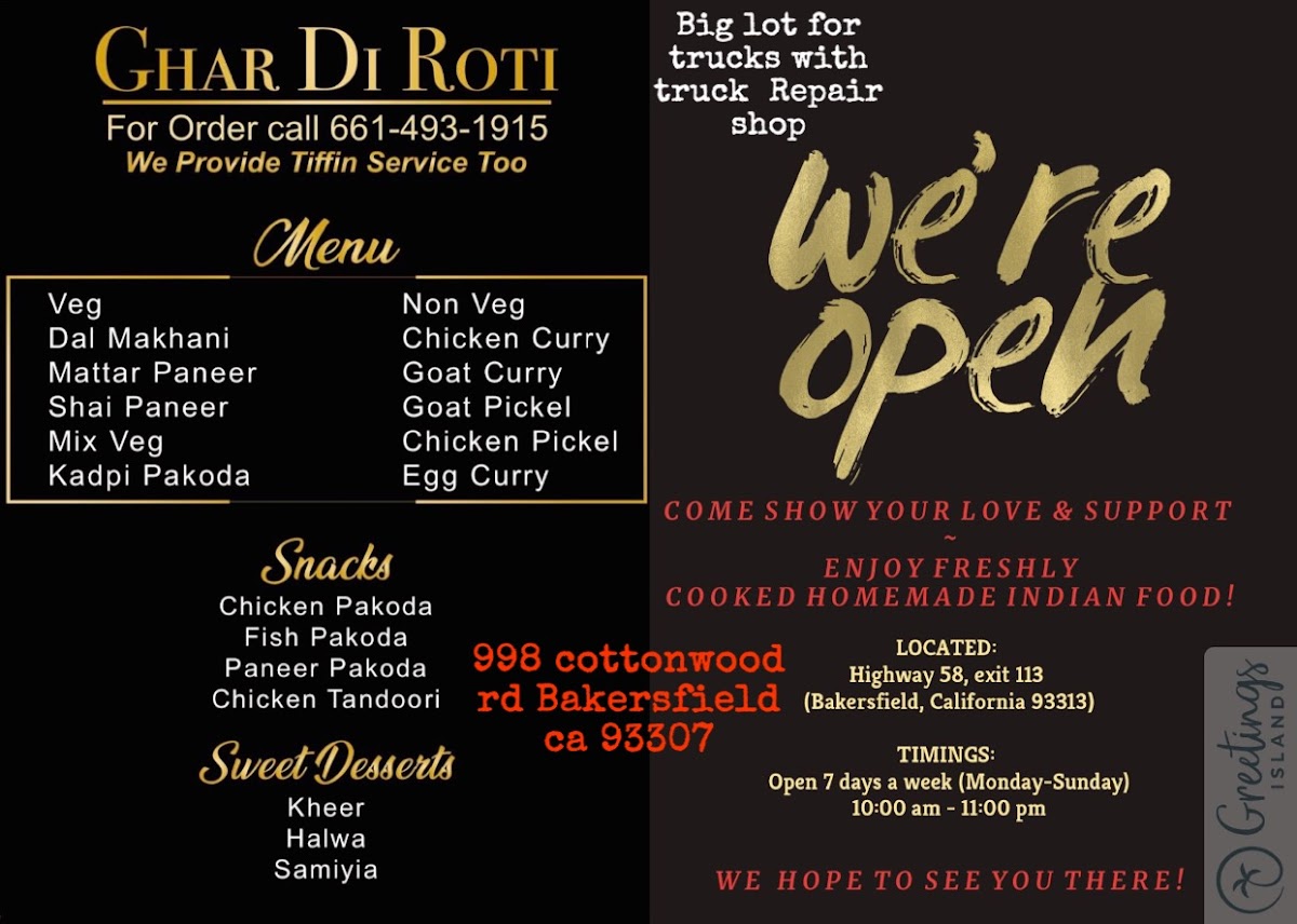 Welcome to Ghar di roti Punjabi dhaba, the hidden gem of authentic Punjabi cuisine nestled in Bakersfield, CA. This charming eatery, located at 998 S Dr. Martin Luther King Jr. Blvd, serves up a delightful menu that radiates homeliness and heart. The offerings range from enticing snacks like Chicken Pakoda and Paneer Pakoda to hearty non-vegetarian delights such as Chicken Curry and Goat Curry.